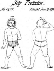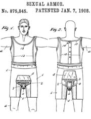 American ingenuity at work in the service of public chastity. (Click each image to see the full patent.) Although it is commonly believed that chastity devices were historically used on women, a search of all US patents categorized under Sexual restraints brings up primarily devices designed for males, both human and horses. (The subcategory exclusively for females, Intravaginal antirape devices, has no patents from before 1923.) |