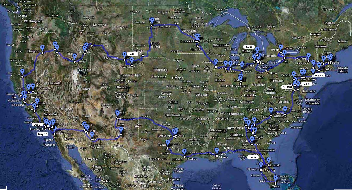 Route of the Registry Road Trip, showing locations of 113 meetings in 22 states, DC, and Canada, from early May through October, 2010. (View larger.) |